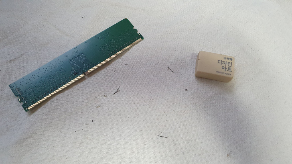 5. 반쯤 포기한 상태로 출장 서비스를 불러야겠다 하고 인터넷을 뒤지던 중, 데스크탑 부팅 실패의 50% 이상은 Ram 램 카드 슬롯 문제로 지우개로 청소한 후 다시 꽂으면 증상이 해결된다. 라고 써있더군요! 할렐루야! 저는 처음에 PCB 반도체 기판이 끄적끄적 낙서장도 아니고 무슨 지우개가 등장하는지 정말 의아했었는데, RAM 카드 하단 접촉부(금속 슬롯 부분)가 오랫동안 사용하면 산화피막이 형성되어 저항이 증가하거나 접촉불량 이 발생할 수 있기 때문에 주기적으로 지우개를 이용해서 청소를 해주면 대부분 해결된다고 합니다! 많은 사람들이 저처럼 컴퓨터 분해에 막연한 어려움을 느끼기 때문에 이런 간단한 문제도 비싼 비용을 지불하고(대략 10만원 선?) 수리를 맡긴다고 합니다.