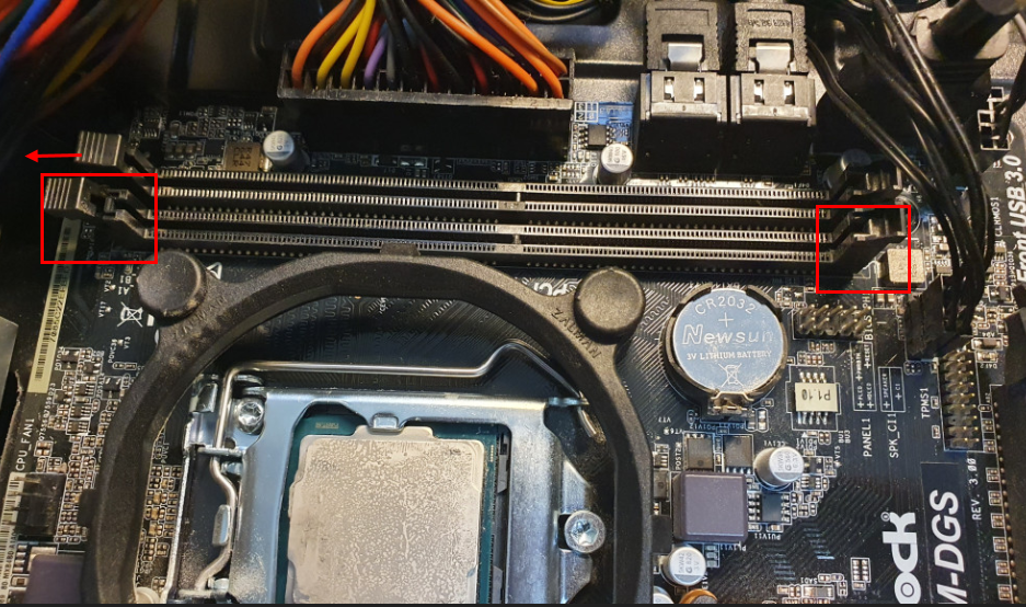 6. 내부 청소를 해주고 나서 드디어 이번 포스팅의 하이라이트인 RAM 청소를 해줍니다. 램 슬롯에서 기존 램을 뽑아내야 하는데요, 양쪽 또는 한쪽의 레버를 풀어주고나서 강하지만 부드러운 힘으로 무를 뽑듯이 쑥 뽑아주셔야 합니다. 저도 램 탈착은 처음이라 조금 버벅거렸는데, 너무 세게 하면 약한 PCB 기판이 손상될 우려가 있기 때문이죠.