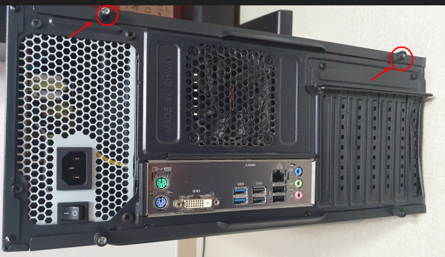 1. 컴퓨터 케이스 분리(aka 배가르기, 개복) : 컴퓨터가 많이 아파하니 수술 집도에 들어갑니다. 먼저 모든 전원을 끄고 뒷면에 붙어있는 케이블들을 모두 분리해줍니다. 뒷면 커버 볼트를 풀어줍니다. 데스크탑이 보통 직육면체인데 한쪽 면만 오픈하면 되므로 고정 볼트도 2개만 풀어주었습니다. 이건 컴퓨터 마다 조금씩 다를거에요. 저 같은 경우 아래 화살표 2군데 해제하였습니다.